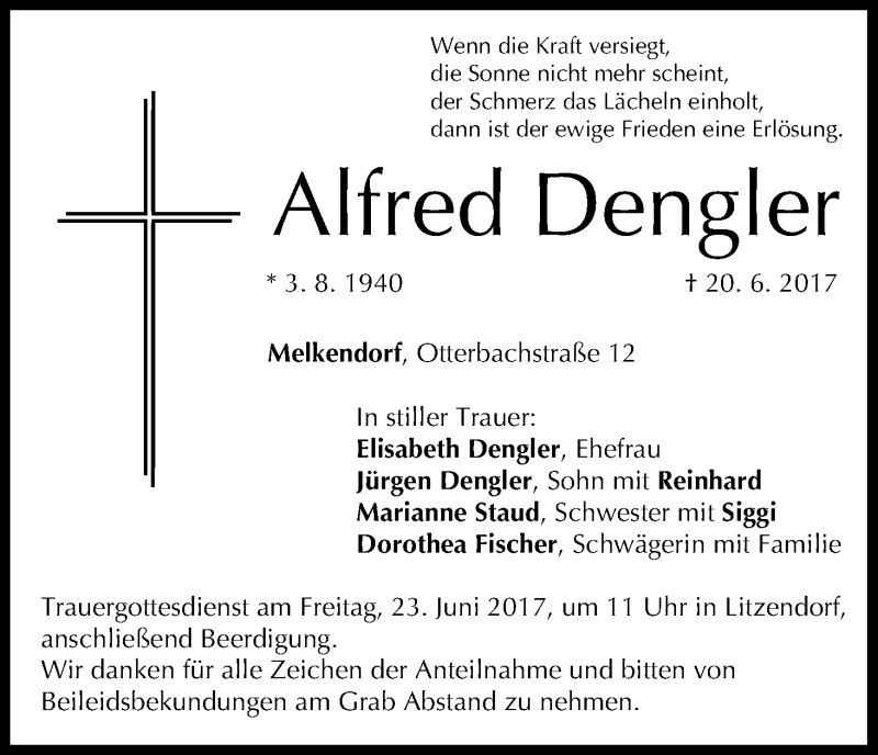 Hier finden Sie alle Traueranzeigen aus der Zeitung, die bisher für Alfred Dengler erschienen sind. Weitere Traueranzeigen, die in der Zeitung erscheinen, werden hier ebenfalls aufgelistet