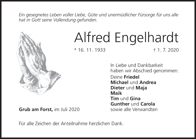 Hier finden Sie alle Traueranzeigen aus der Zeitung, die bisher für Alfred Engelhardt erschienen sind. Weitere Traueranzeigen, die in der Zeitung erscheinen, werden hier ebenfalls aufgelistet