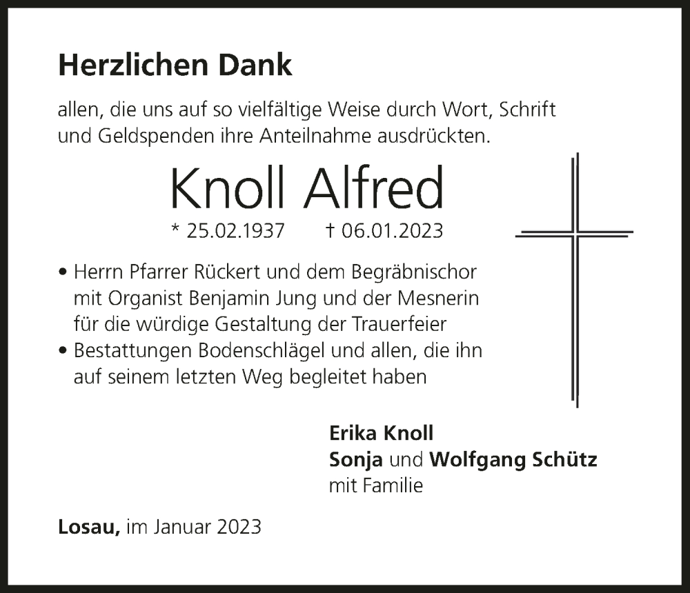 Hier finden Sie alle Traueranzeigen aus der Zeitung, die bisher für Alfred Knoll erschienen sind. Weitere Traueranzeigen, die in der Zeitung erscheinen, werden hier ebenfalls aufgelistet