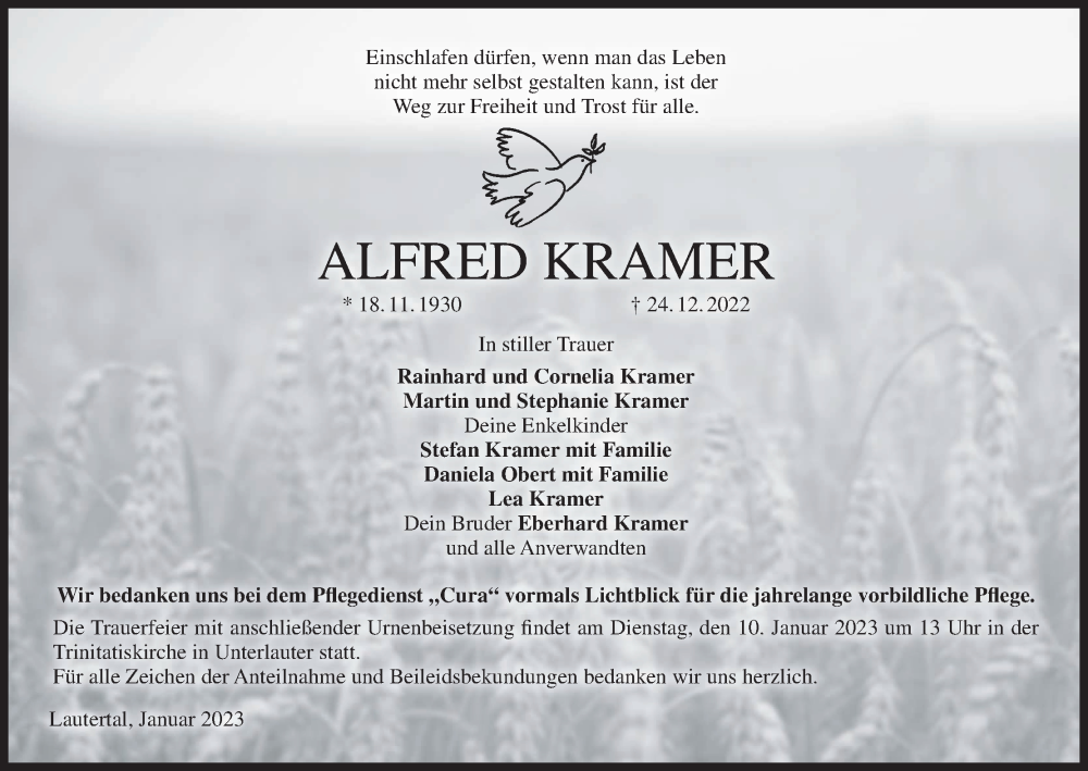 Hier finden Sie alle Traueranzeigen aus der Zeitung, die bisher für Alfred Kramer erschienen sind. Weitere Traueranzeigen, die in der Zeitung erscheinen, werden hier ebenfalls aufgelistet
