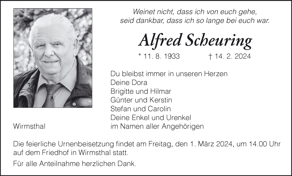 Hier finden Sie alle Traueranzeigen aus der Zeitung, die bisher für Alfred Scheuring erschienen sind. Weitere Traueranzeigen, die in der Zeitung erscheinen, werden hier ebenfalls aufgelistet
