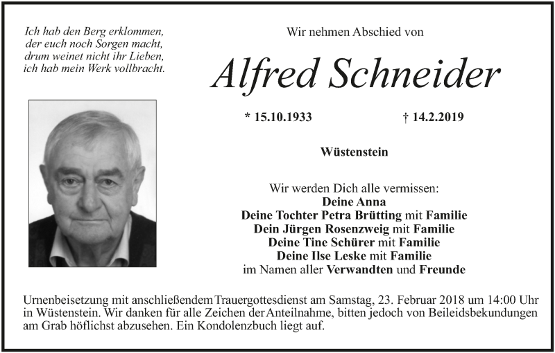 Hier finden Sie alle Traueranzeigen aus der Zeitung, die bisher für Alfred Schneider erschienen sind. Weitere Traueranzeigen, die in der Zeitung erscheinen, werden hier ebenfalls aufgelistet