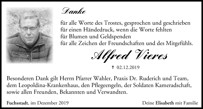 Hier finden Sie alle Traueranzeigen aus der Zeitung, die bisher für Alfred Vieres erschienen sind. Weitere Traueranzeigen, die in der Zeitung erscheinen, werden hier ebenfalls aufgelistet