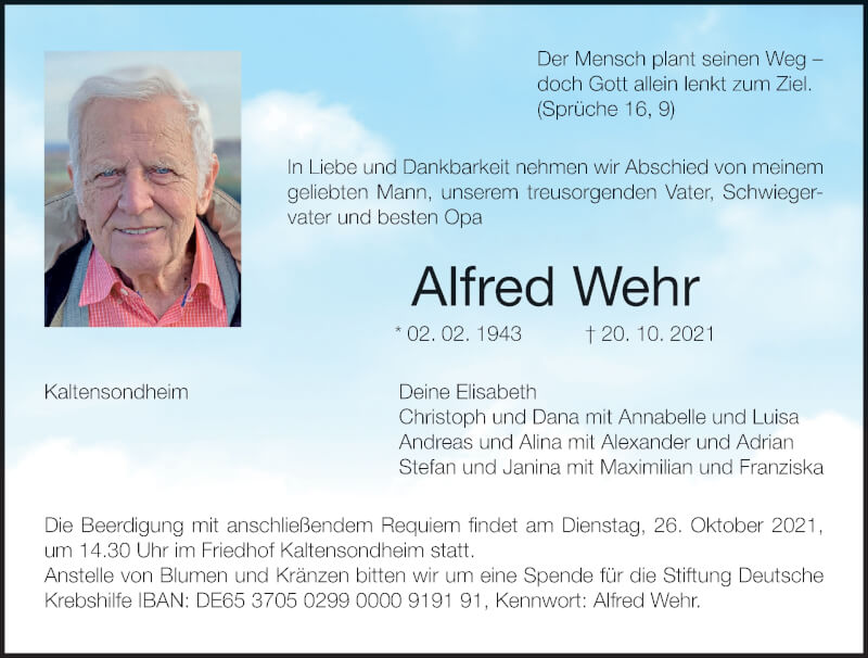 Hier finden Sie alle Traueranzeigen aus der Zeitung, die bisher für Alfred Wehr erschienen sind. Weitere Traueranzeigen, die in der Zeitung erscheinen, werden hier ebenfalls aufgelistet