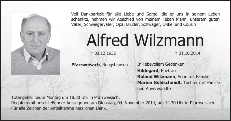 Hier finden Sie alle Traueranzeigen aus der Zeitung, die bisher für Alfred Wilzmann erschienen sind. Weitere Traueranzeigen, die in der Zeitung erscheinen, werden hier ebenfalls aufgelistet