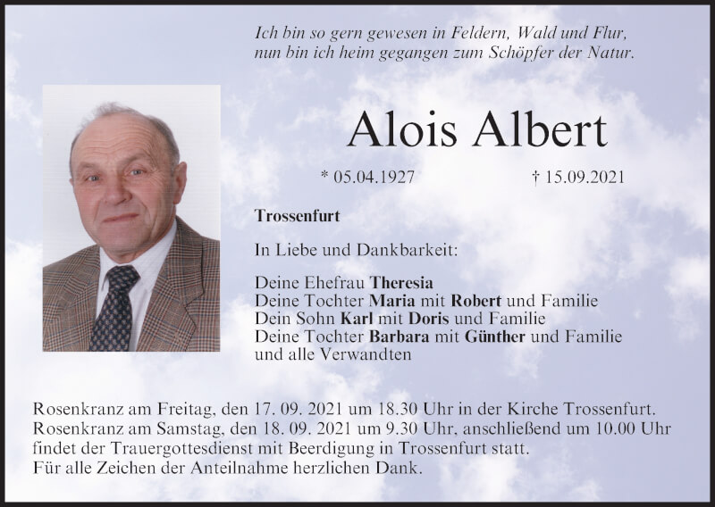 Hier finden Sie alle Traueranzeigen aus der Zeitung, die bisher für Alois Albert erschienen sind. Weitere Traueranzeigen, die in der Zeitung erscheinen, werden hier ebenfalls aufgelistet