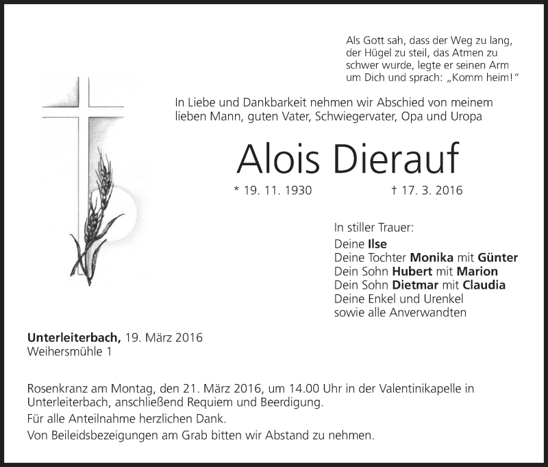 Hier finden Sie alle Traueranzeigen aus der Zeitung, die bisher für Alois Dierauf erschienen sind. Weitere Traueranzeigen, die in der Zeitung erscheinen, werden hier ebenfalls aufgelistet