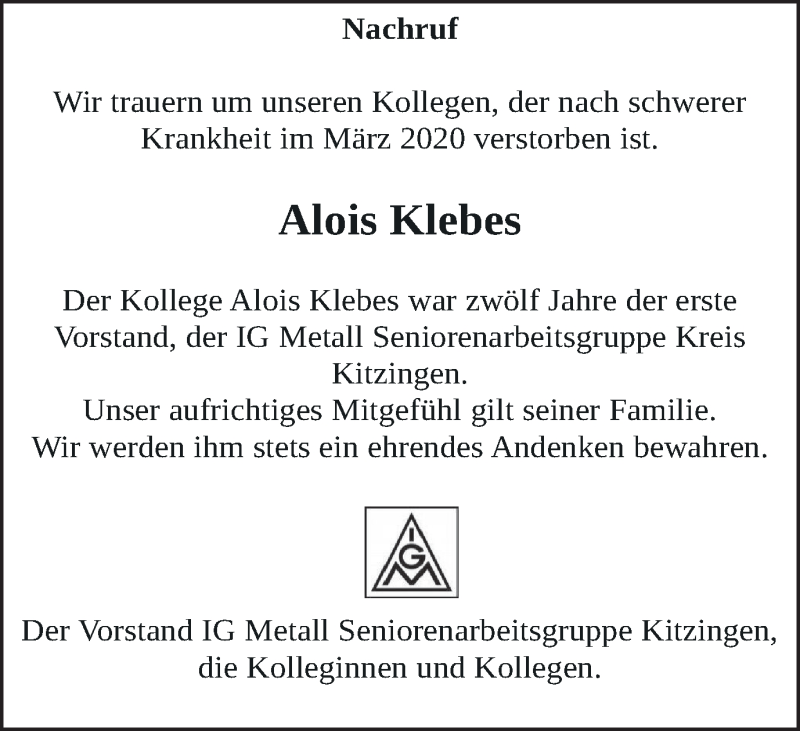 Hier finden Sie alle Traueranzeigen aus der Zeitung, die bisher für Alois Klebes erschienen sind. Weitere Traueranzeigen, die in der Zeitung erscheinen, werden hier ebenfalls aufgelistet