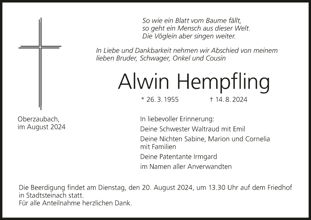 Hier finden Sie alle Traueranzeigen aus der Zeitung, die bisher für Alwin Hempfling erschienen sind. Weitere Traueranzeigen, die in der Zeitung erscheinen, werden hier ebenfalls aufgelistet