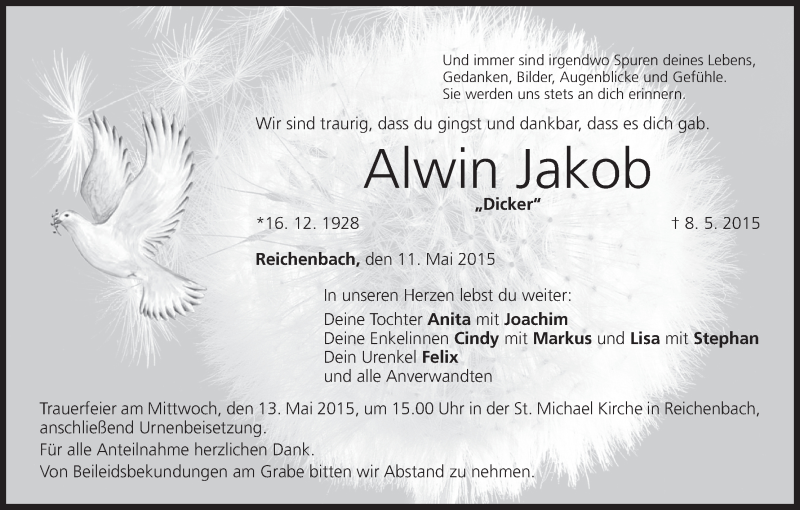 Hier finden Sie alle Traueranzeigen aus der Zeitung, die bisher für Alwin Jakob erschienen sind. Weitere Traueranzeigen, die in der Zeitung erscheinen, werden hier ebenfalls aufgelistet