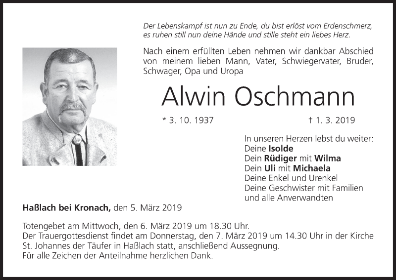 Hier finden Sie alle Traueranzeigen aus der Zeitung, die bisher für Alwin Oschmann erschienen sind. Weitere Traueranzeigen, die in der Zeitung erscheinen, werden hier ebenfalls aufgelistet