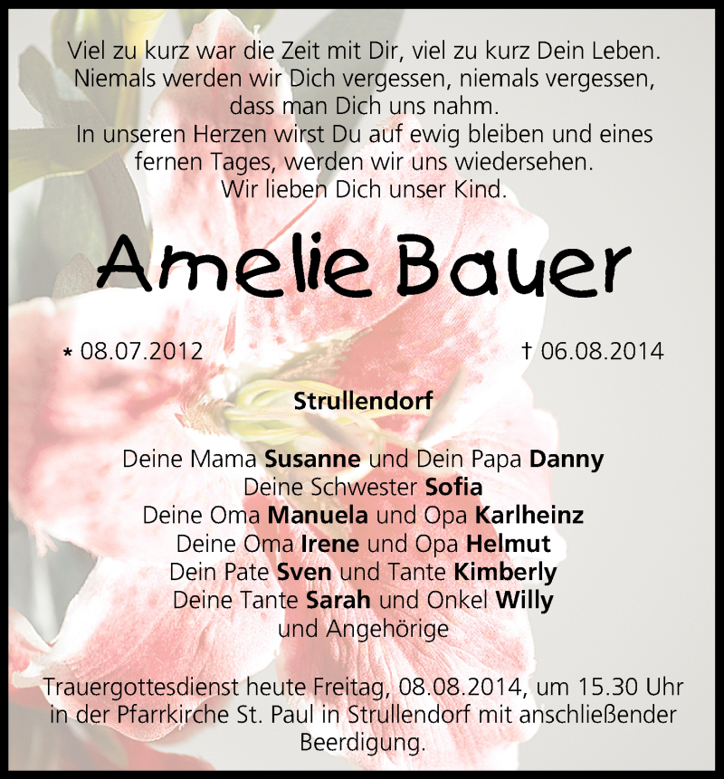 Hier finden Sie alle Traueranzeigen aus der Zeitung, die bisher für Amelie Bauer erschienen sind. Weitere Traueranzeigen, die in der Zeitung erscheinen, werden hier ebenfalls aufgelistet