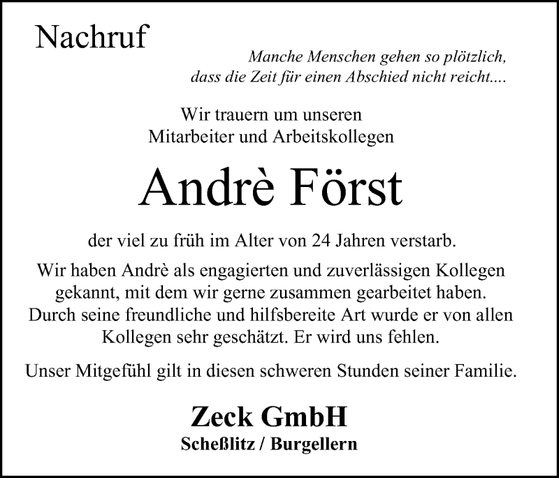 Hier finden Sie alle Traueranzeigen aus der Zeitung, die bisher für Andrè Först erschienen sind. Weitere Traueranzeigen, die in der Zeitung erscheinen, werden hier ebenfalls aufgelistet