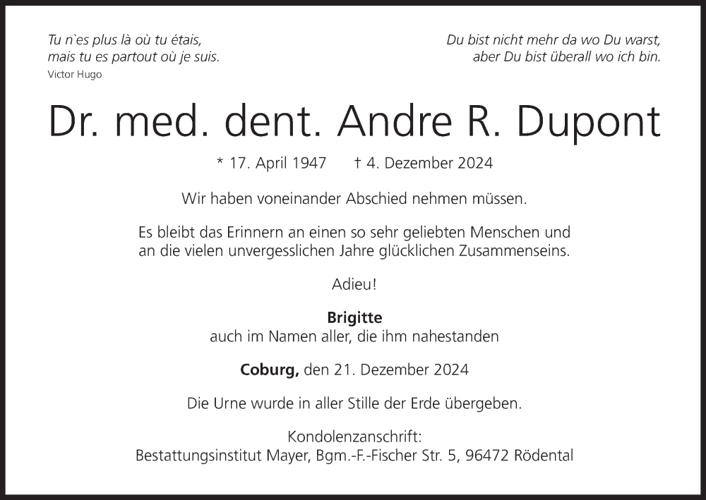 Hier finden Sie alle Traueranzeigen aus der Zeitung, die bisher für Andre R. Dupont erschienen sind. Weitere Traueranzeigen, die in der Zeitung erscheinen, werden hier ebenfalls aufgelistet