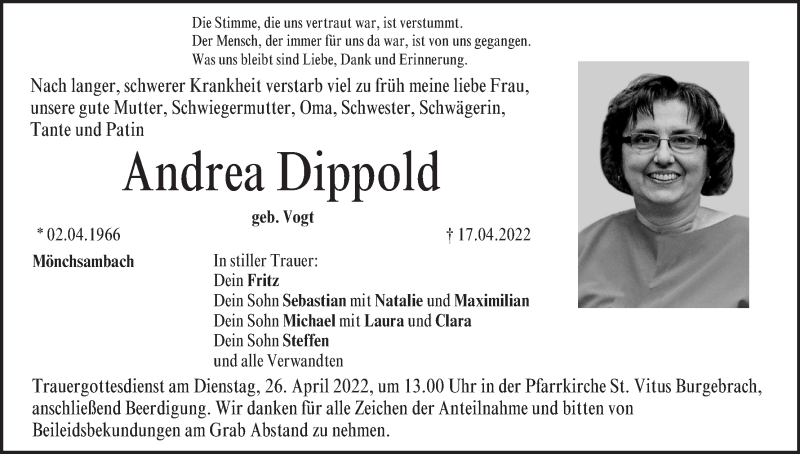 Hier finden Sie alle Traueranzeigen aus der Zeitung, die bisher für Andrea Dippold erschienen sind. Weitere Traueranzeigen, die in der Zeitung erscheinen, werden hier ebenfalls aufgelistet