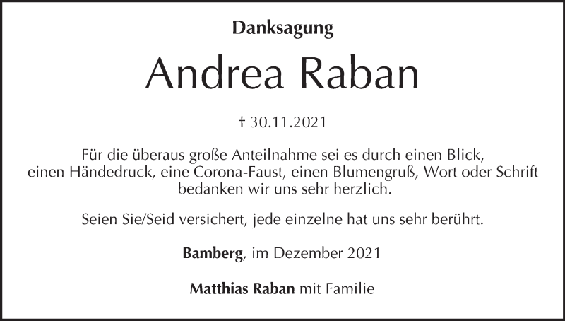 Hier finden Sie alle Traueranzeigen aus der Zeitung, die bisher für Andrea Raban erschienen sind. Weitere Traueranzeigen, die in der Zeitung erscheinen, werden hier ebenfalls aufgelistet