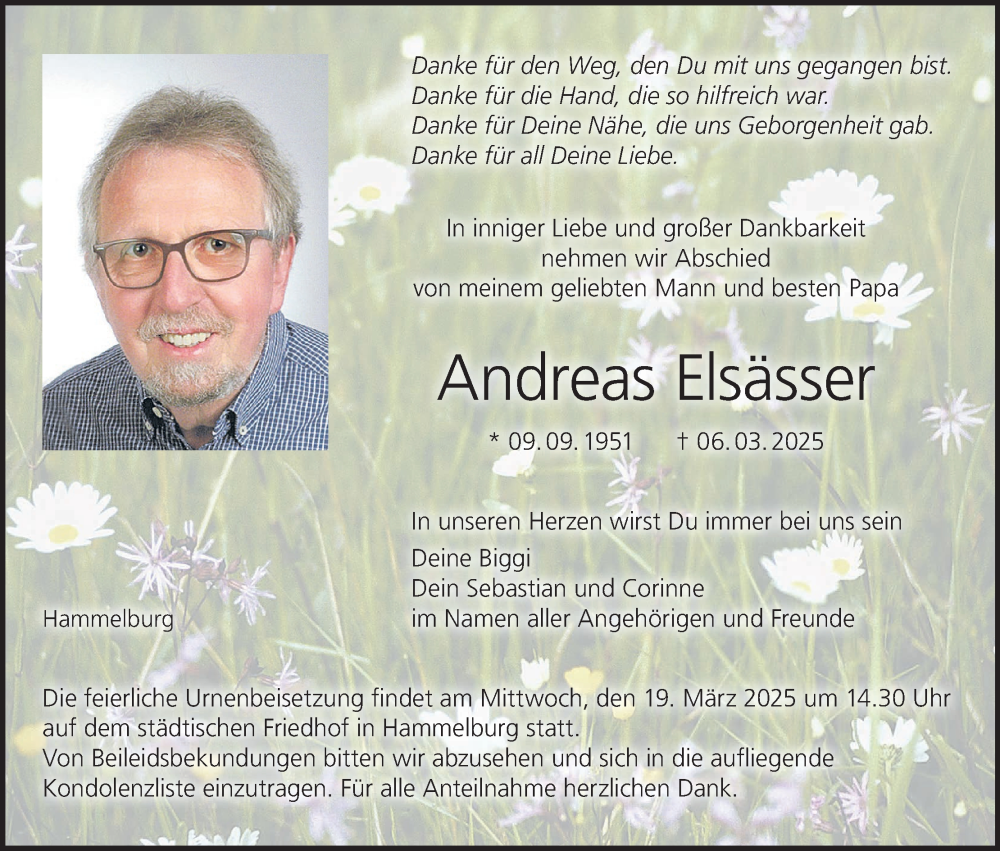 Hier finden Sie alle Traueranzeigen aus der Zeitung, die bisher für Andreas Elsässer erschienen sind. Weitere Traueranzeigen, die in der Zeitung erscheinen, werden hier ebenfalls aufgelistet