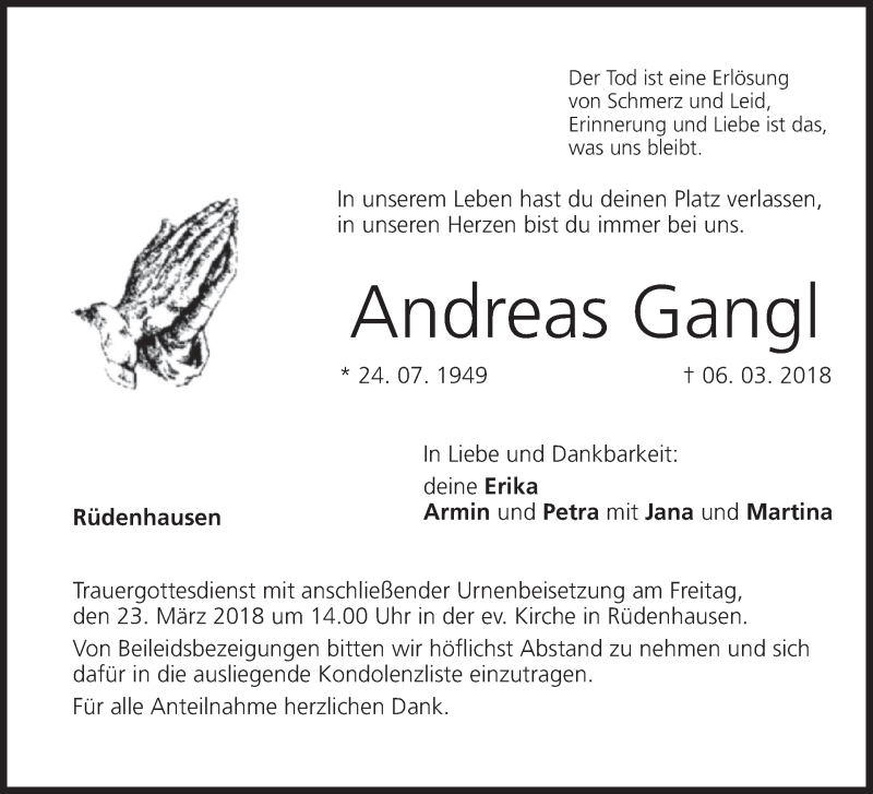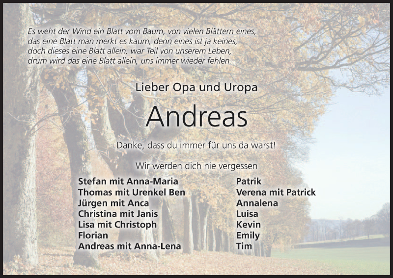 Hier finden Sie alle Traueranzeigen aus der Zeitung, die bisher für Andreas Gangl erschienen sind. Weitere Traueranzeigen, die in der Zeitung erscheinen, werden hier ebenfalls aufgelistet