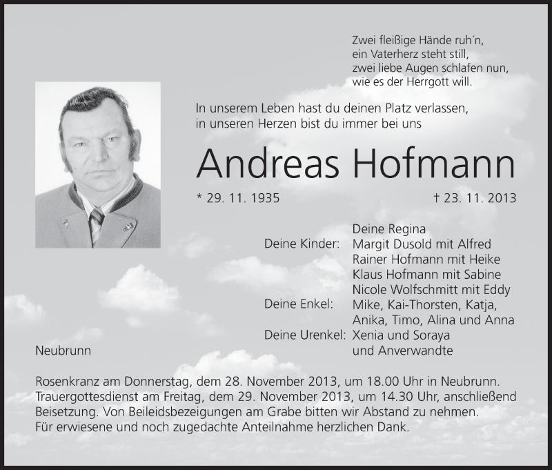Hier finden Sie alle Traueranzeigen aus der Zeitung, die bisher für Andreas Hofmann erschienen sind. Weitere Traueranzeigen, die in der Zeitung erscheinen, werden hier ebenfalls aufgelistet