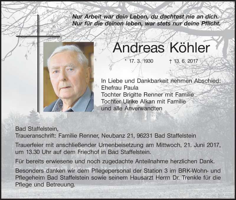 Hier finden Sie alle Traueranzeigen aus der Zeitung, die bisher für Andreas Köhler erschienen sind. Weitere Traueranzeigen, die in der Zeitung erscheinen, werden hier ebenfalls aufgelistet