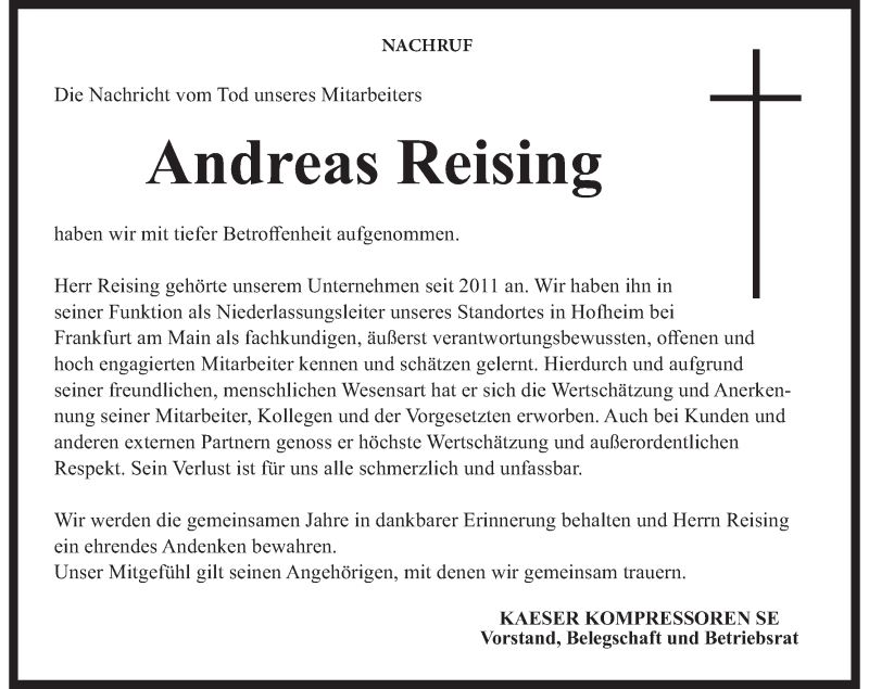 Hier finden Sie alle Traueranzeigen aus der Zeitung, die bisher für Andreas Reising erschienen sind. Weitere Traueranzeigen, die in der Zeitung erscheinen, werden hier ebenfalls aufgelistet