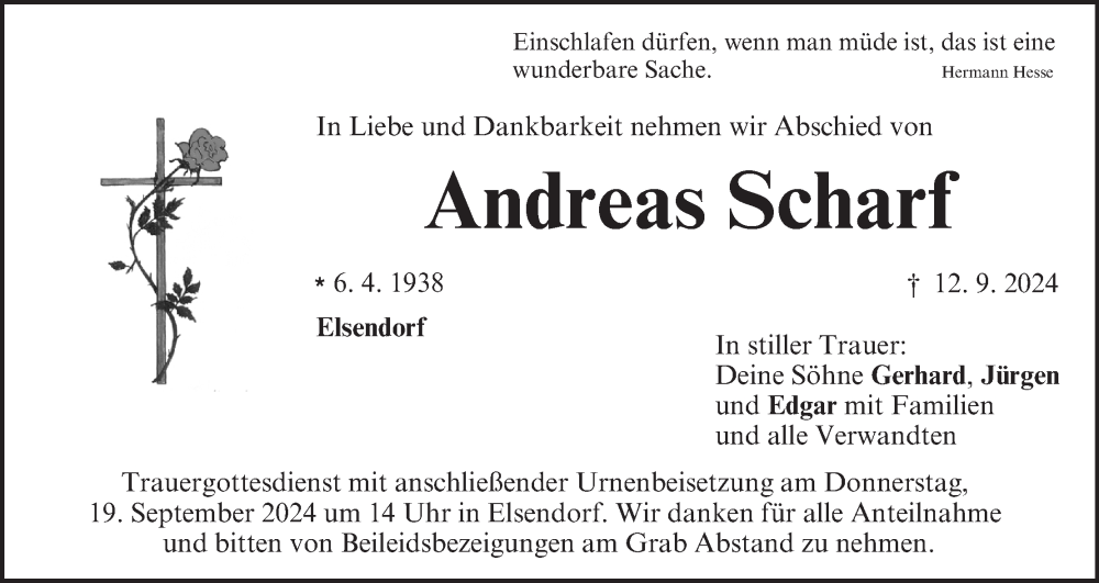 Hier finden Sie alle Traueranzeigen aus der Zeitung, die bisher für Andreas Scharf erschienen sind. Weitere Traueranzeigen, die in der Zeitung erscheinen, werden hier ebenfalls aufgelistet