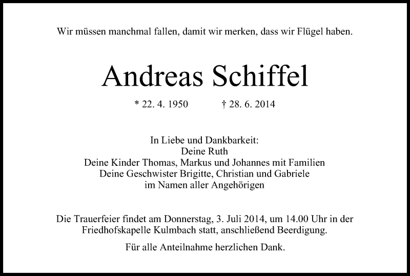 Hier finden Sie alle Traueranzeigen aus der Zeitung, die bisher für Andreas Schiffel erschienen sind. Weitere Traueranzeigen, die in der Zeitung erscheinen, werden hier ebenfalls aufgelistet