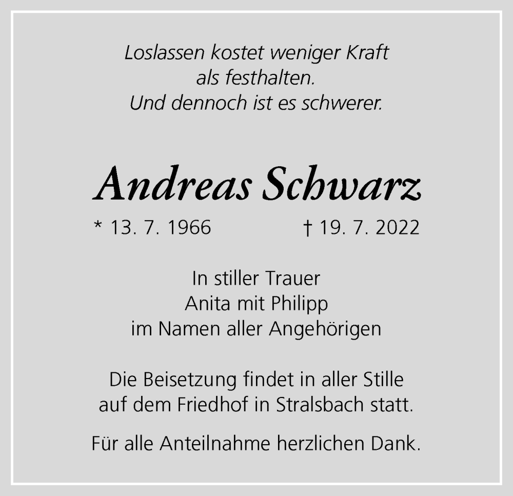 Hier finden Sie alle Traueranzeigen aus der Zeitung, die bisher für Andreas Schwarz erschienen sind. Weitere Traueranzeigen, die in der Zeitung erscheinen, werden hier ebenfalls aufgelistet