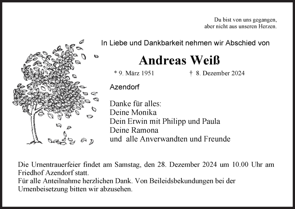 Hier finden Sie alle Traueranzeigen aus der Zeitung, die bisher für Andreas Weiß erschienen sind. Weitere Traueranzeigen, die in der Zeitung erscheinen, werden hier ebenfalls aufgelistet
