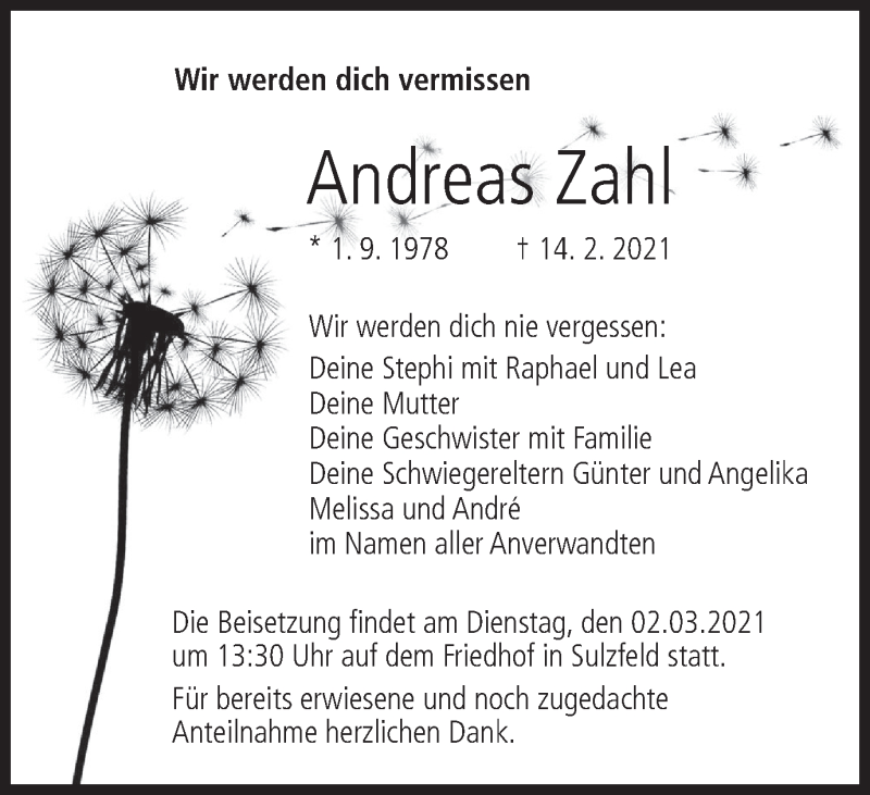 Hier finden Sie alle Traueranzeigen aus der Zeitung, die bisher für Andreas Zahl erschienen sind. Weitere Traueranzeigen, die in der Zeitung erscheinen, werden hier ebenfalls aufgelistet