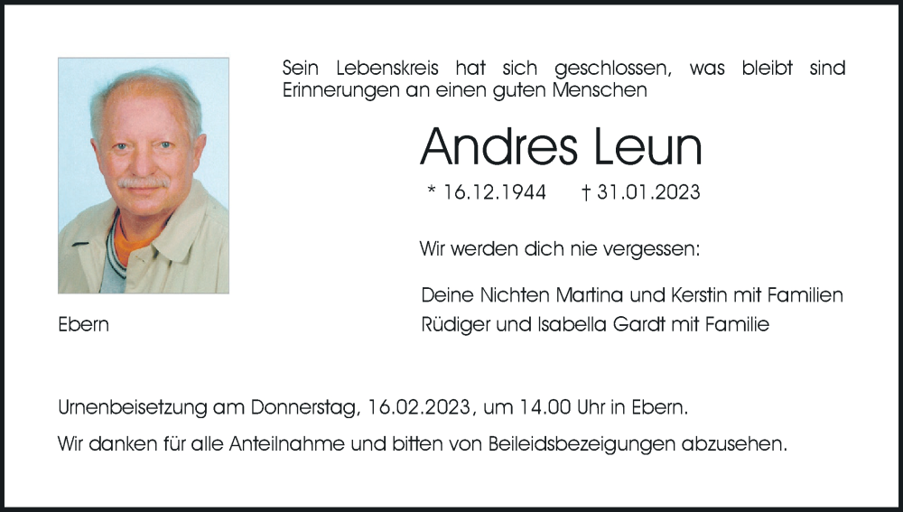 Hier finden Sie alle Traueranzeigen aus der Zeitung, die bisher für Andres Leun erschienen sind. Weitere Traueranzeigen, die in der Zeitung erscheinen, werden hier ebenfalls aufgelistet