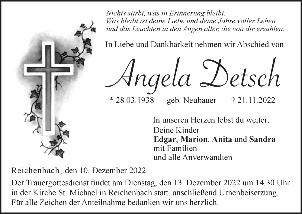 Hier finden Sie alle Traueranzeigen aus der Zeitung, die bisher für Angela Detsch erschienen sind. Weitere Traueranzeigen, die in der Zeitung erscheinen, werden hier ebenfalls aufgelistet