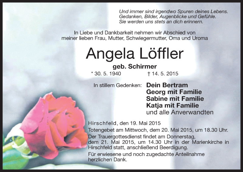 Hier finden Sie alle Traueranzeigen aus der Zeitung, die bisher für Angela Löffler erschienen sind. Weitere Traueranzeigen, die in der Zeitung erscheinen, werden hier ebenfalls aufgelistet