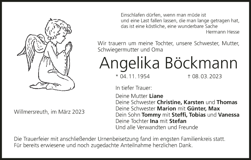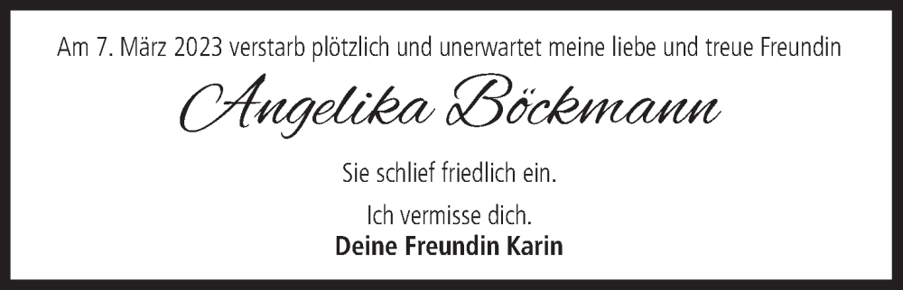 Hier finden Sie alle Traueranzeigen aus der Zeitung, die bisher für Angelika Böckmann erschienen sind. Weitere Traueranzeigen, die in der Zeitung erscheinen, werden hier ebenfalls aufgelistet