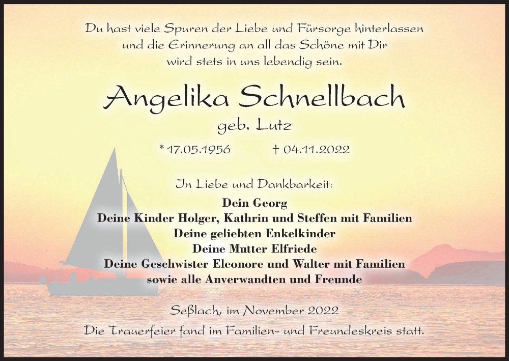 Hier finden Sie alle Traueranzeigen aus der Zeitung, die bisher für Angelika Schnellbach erschienen sind. Weitere Traueranzeigen, die in der Zeitung erscheinen, werden hier ebenfalls aufgelistet
