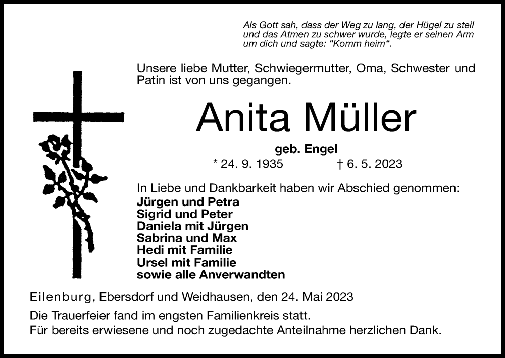 Hier finden Sie alle Traueranzeigen aus der Zeitung, die bisher für Anita Müller erschienen sind. Weitere Traueranzeigen, die in der Zeitung erscheinen, werden hier ebenfalls aufgelistet