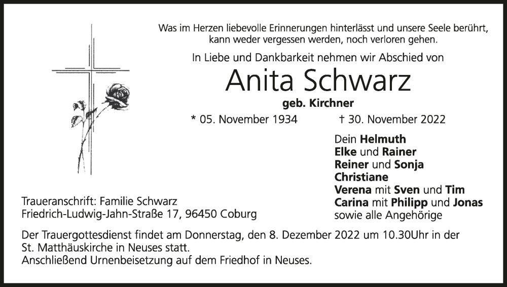 Hier finden Sie alle Traueranzeigen aus der Zeitung, die bisher für Anita Schwarz erschienen sind. Weitere Traueranzeigen, die in der Zeitung erscheinen, werden hier ebenfalls aufgelistet