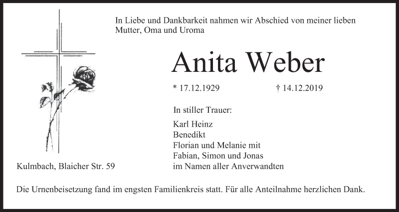 Hier finden Sie alle Traueranzeigen aus der Zeitung, die bisher für Anita Weber erschienen sind. Weitere Traueranzeigen, die in der Zeitung erscheinen, werden hier ebenfalls aufgelistet