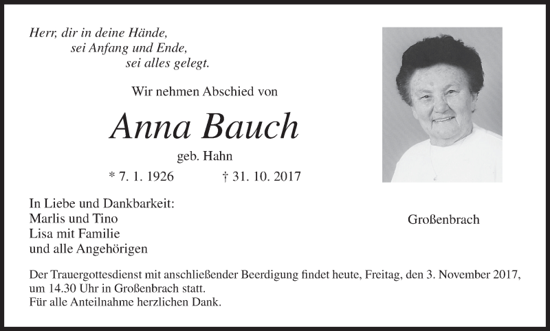 Hier finden Sie alle Traueranzeigen aus der Zeitung, die bisher für Anna Bauch erschienen sind. Weitere Traueranzeigen, die in der Zeitung erscheinen, werden hier ebenfalls aufgelistet