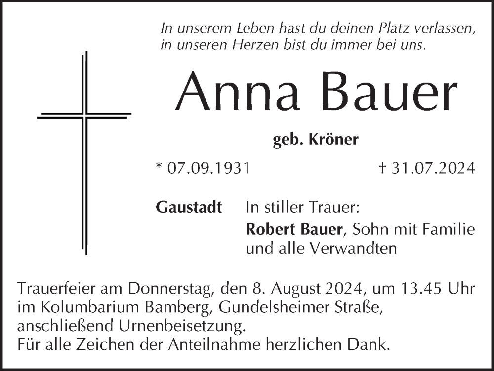 Hier finden Sie alle Traueranzeigen aus der Zeitung, die bisher für Anna Bauer erschienen sind. Weitere Traueranzeigen, die in der Zeitung erscheinen, werden hier ebenfalls aufgelistet