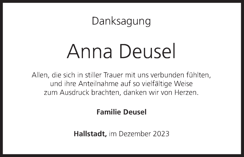 Hier finden Sie alle Traueranzeigen aus der Zeitung, die bisher für Anna Deusel erschienen sind. Weitere Traueranzeigen, die in der Zeitung erscheinen, werden hier ebenfalls aufgelistet