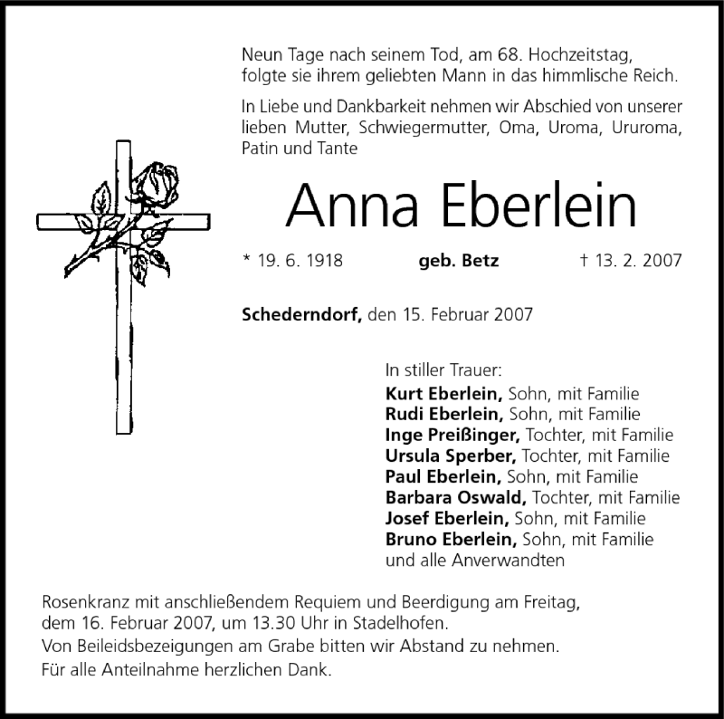 Hier finden Sie alle Traueranzeigen aus der Zeitung, die bisher für Anna Eberlein erschienen sind. Weitere Traueranzeigen, die in der Zeitung erscheinen, werden hier ebenfalls aufgelistet