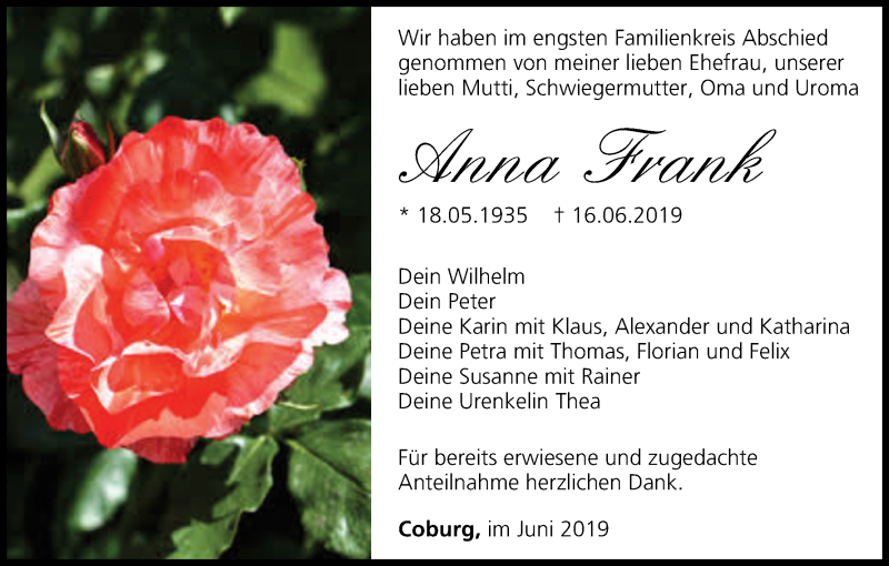 Hier finden Sie alle Traueranzeigen aus der Zeitung, die bisher für Anna Frank erschienen sind. Weitere Traueranzeigen, die in der Zeitung erscheinen, werden hier ebenfalls aufgelistet