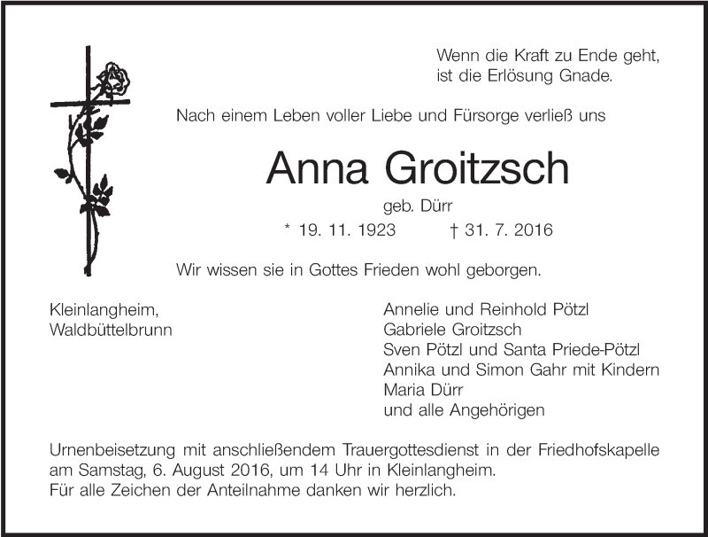Hier finden Sie alle Traueranzeigen aus der Zeitung, die bisher für Anna Groitzsch erschienen sind. Weitere Traueranzeigen, die in der Zeitung erscheinen, werden hier ebenfalls aufgelistet