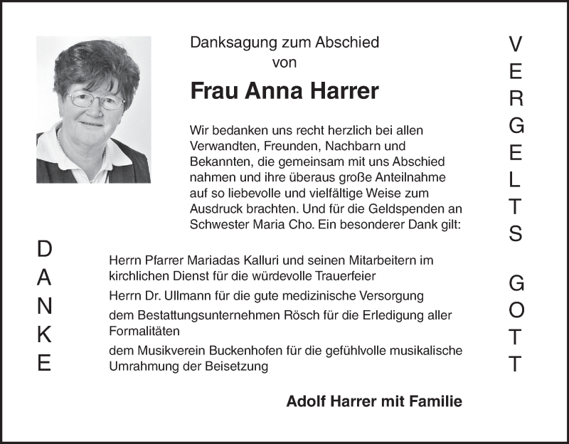 Hier finden Sie alle Traueranzeigen aus der Zeitung, die bisher für Anna Harrer erschienen sind. Weitere Traueranzeigen, die in der Zeitung erscheinen, werden hier ebenfalls aufgelistet