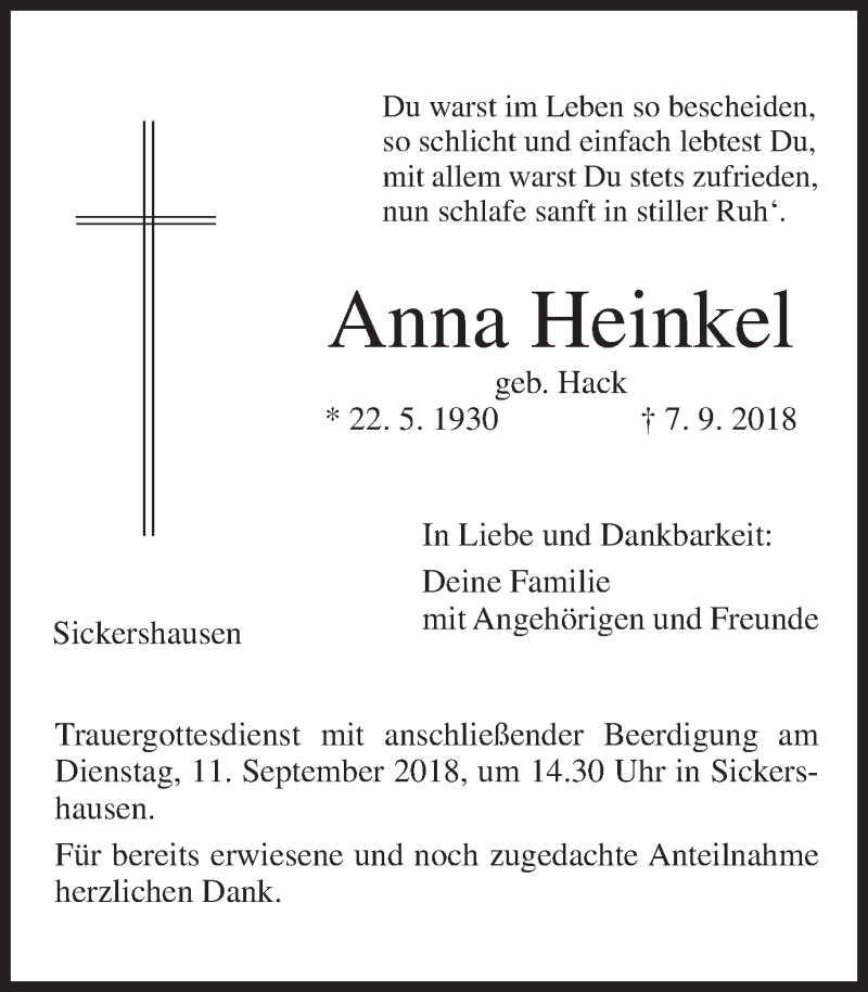 Hier finden Sie alle Traueranzeigen aus der Zeitung, die bisher für Anna Heinkel erschienen sind. Weitere Traueranzeigen, die in der Zeitung erscheinen, werden hier ebenfalls aufgelistet