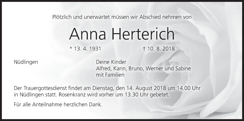 Hier finden Sie alle Traueranzeigen aus der Zeitung, die bisher für Anna Herterich erschienen sind. Weitere Traueranzeigen, die in der Zeitung erscheinen, werden hier ebenfalls aufgelistet
