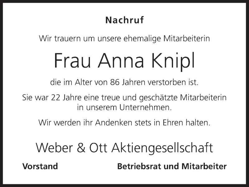 Hier finden Sie alle Traueranzeigen aus der Zeitung, die bisher für Anna Knipl erschienen sind. Weitere Traueranzeigen, die in der Zeitung erscheinen, werden hier ebenfalls aufgelistet