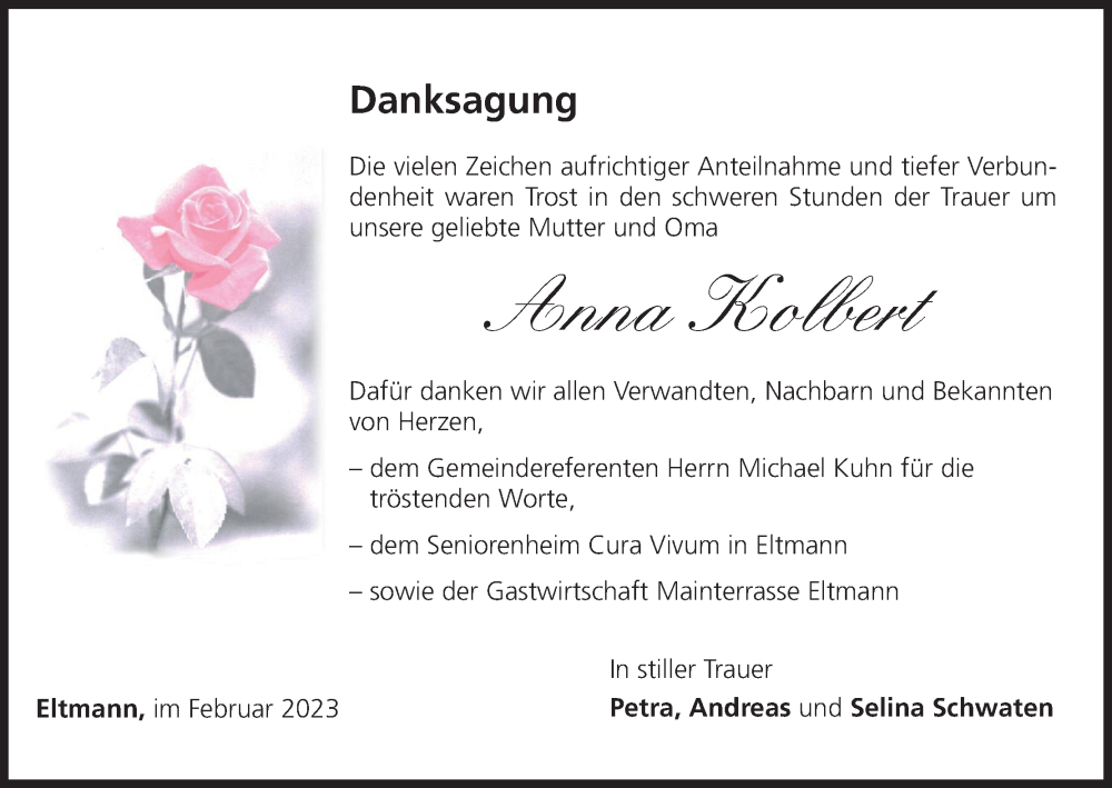 Hier finden Sie alle Traueranzeigen aus der Zeitung, die bisher für Anna Kolbert erschienen sind. Weitere Traueranzeigen, die in der Zeitung erscheinen, werden hier ebenfalls aufgelistet