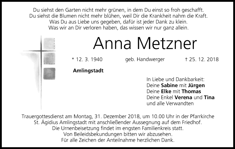 Hier finden Sie alle Traueranzeigen aus der Zeitung, die bisher für Anna Metzner erschienen sind. Weitere Traueranzeigen, die in der Zeitung erscheinen, werden hier ebenfalls aufgelistet